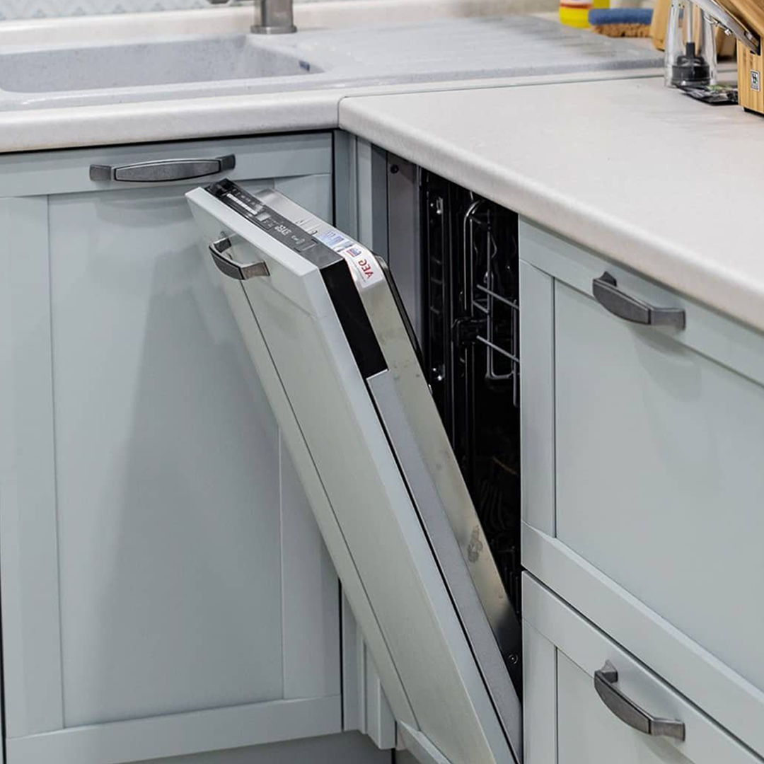 Угловой шкаф может быть по максимуму задействован под хранение, а пользоваться им становится намного удобнее, чем без этого умной конструкции.