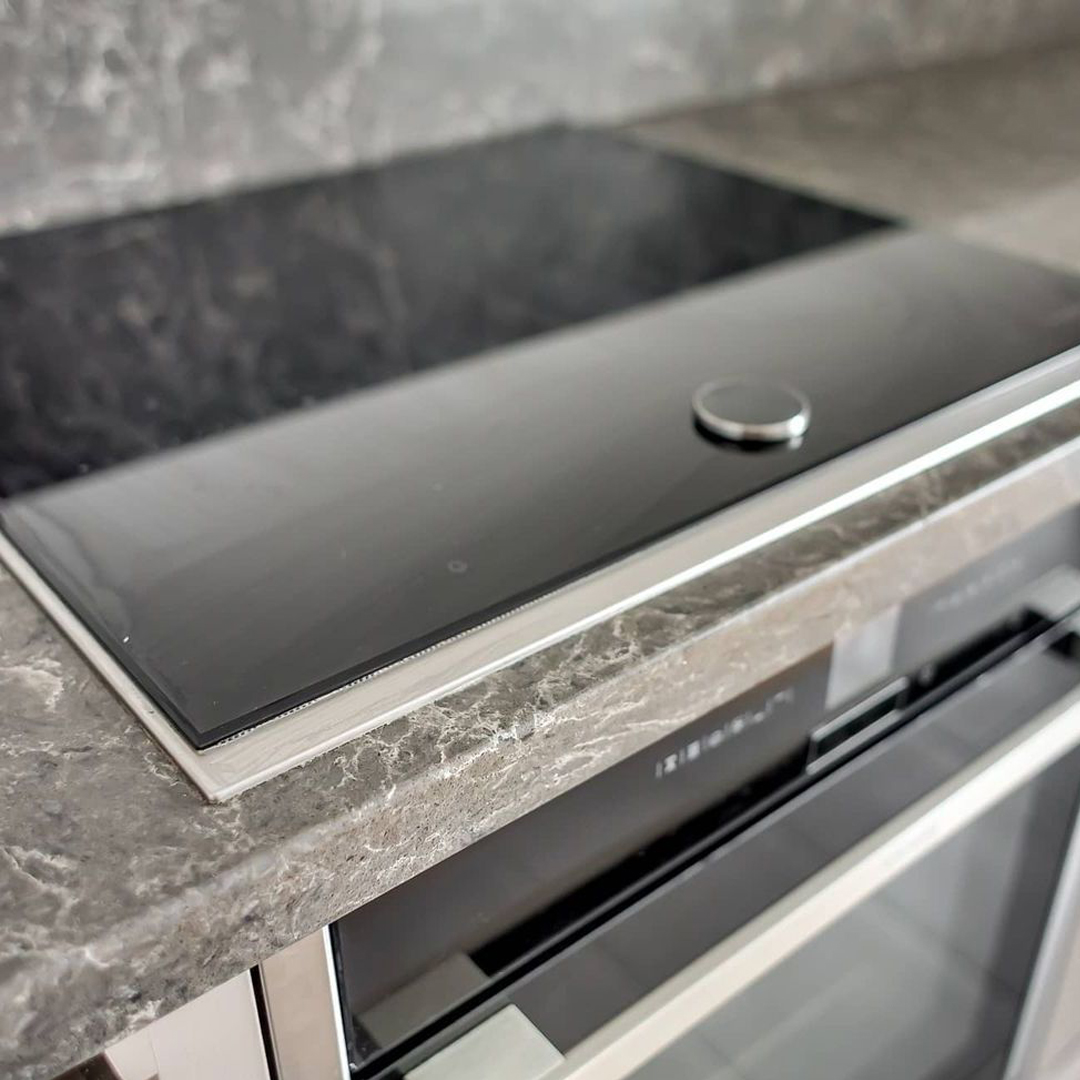 Скинали в цвет столешницы смотрится эстетично и гармонично не уступая по свойствам плитке.