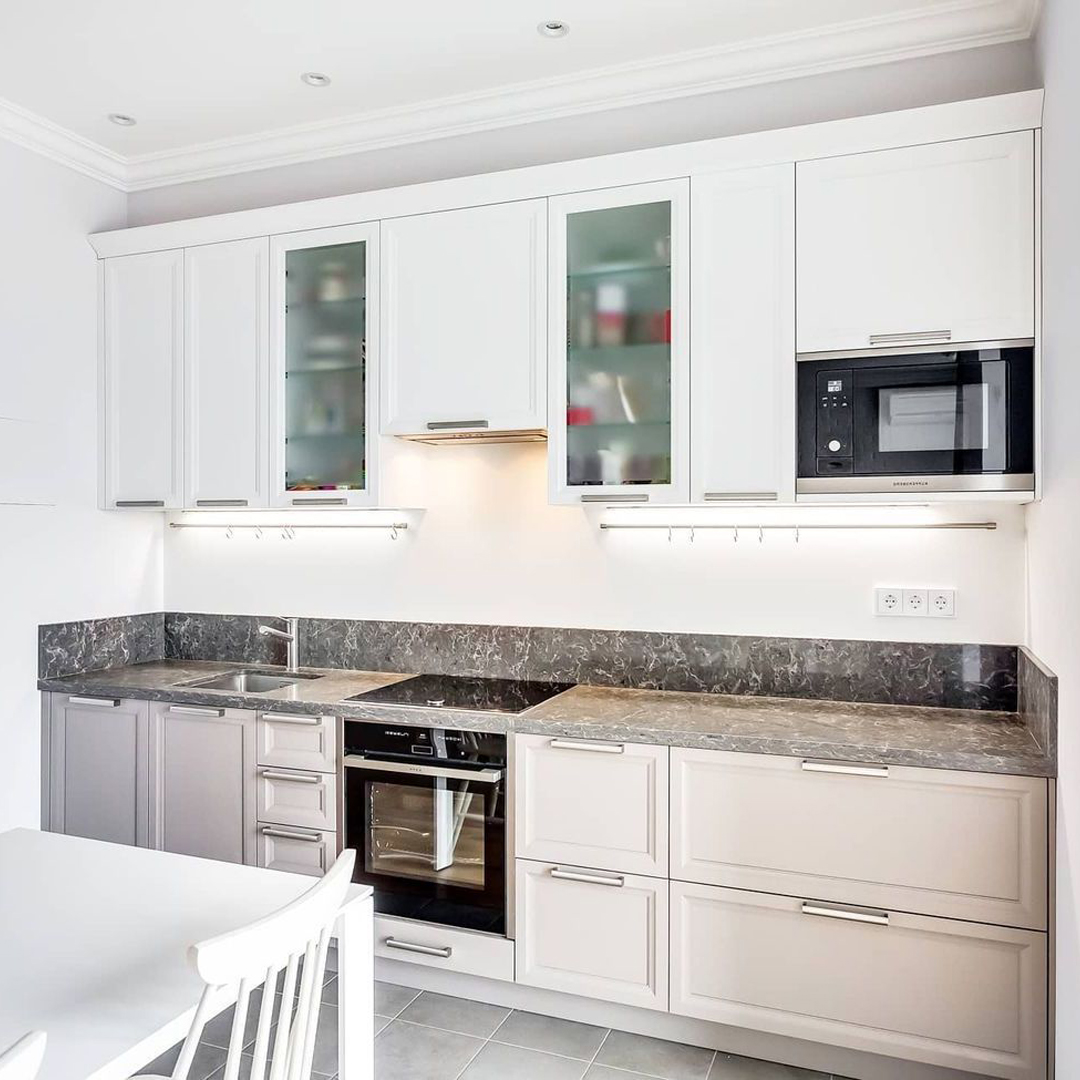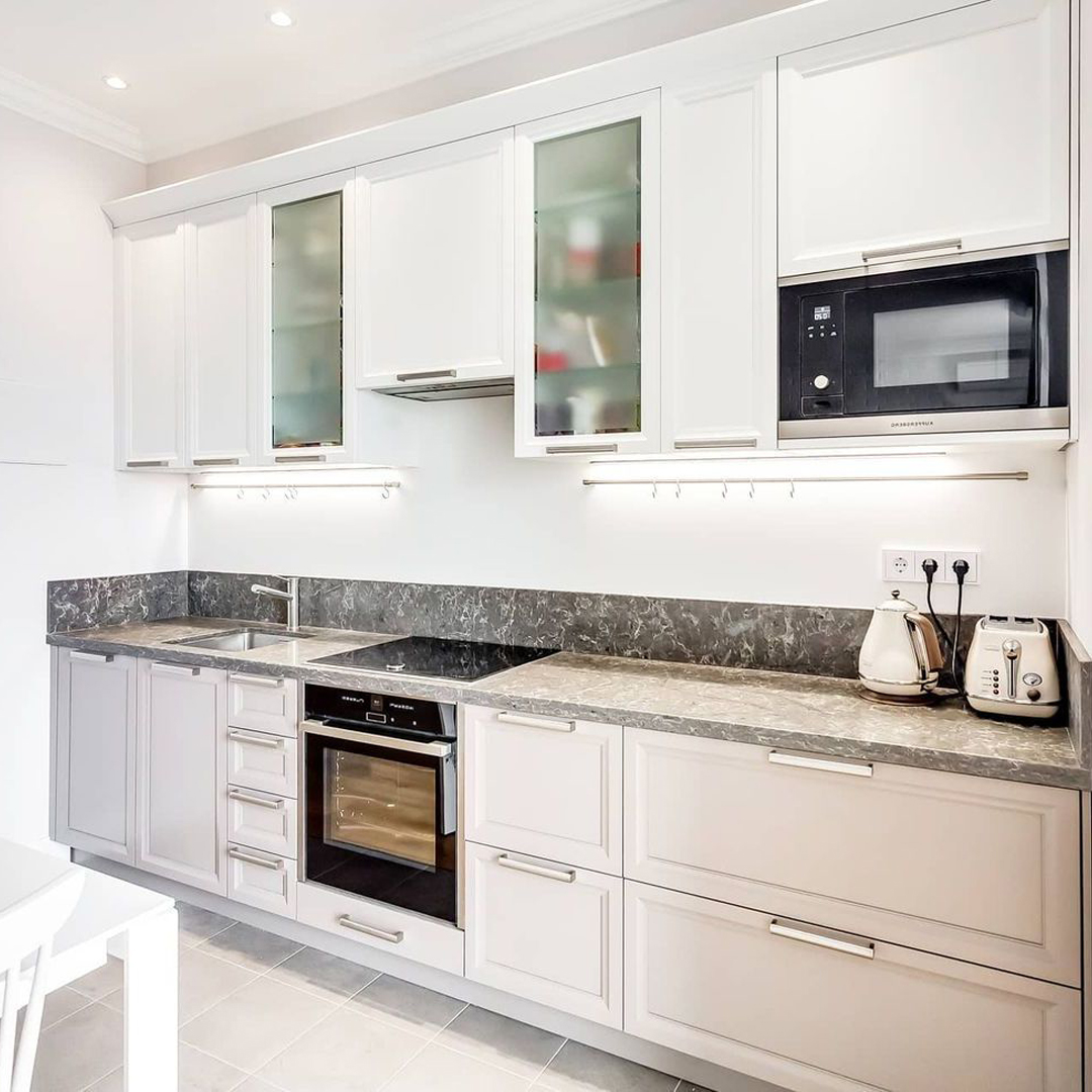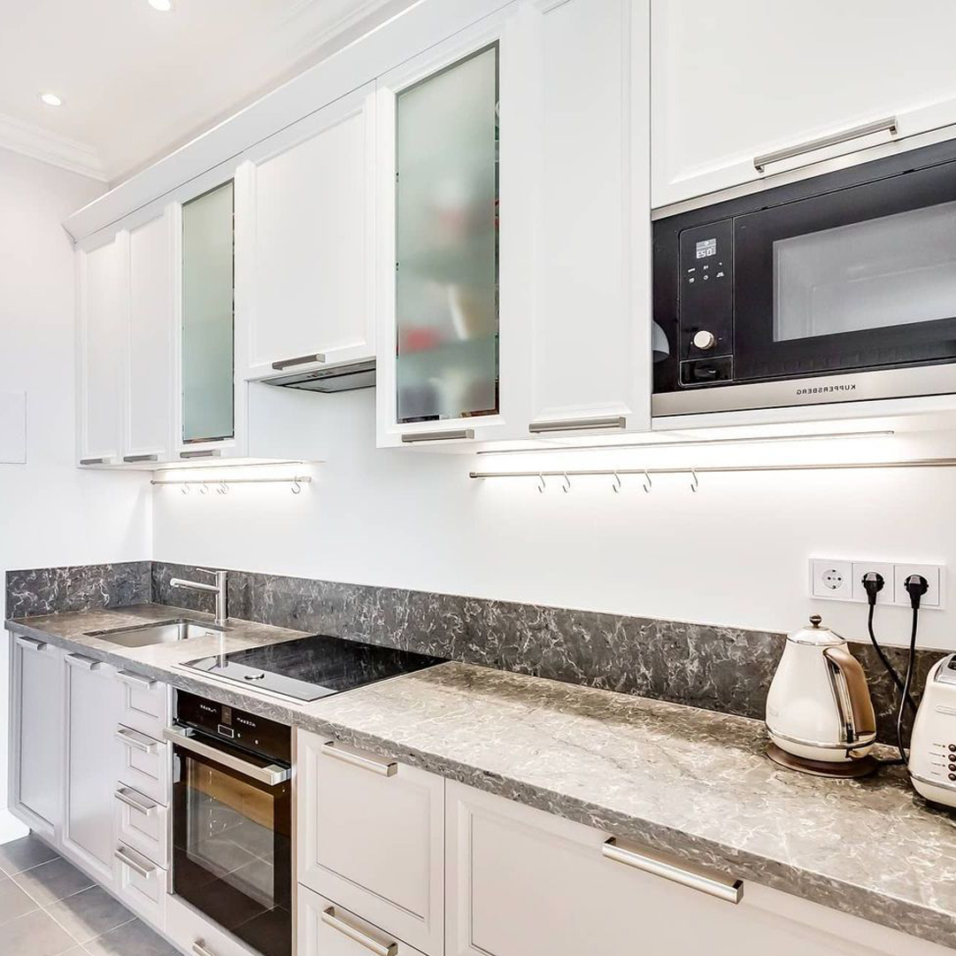 Можно сказать, что рабочая зона на кухне занимает всю её площадь. Отчасти это так, но у каждой зоны свои задачи — мытье продуктов и посуды, хранение, подготовка, приготовление. И если от варочной поверхности или классических шкафов в отдельных кухнях можно отказаться, то пустая столешница для нарезки и других манипуляций нужна всем. Золотой стандарт: даже в самой крошечной кухне она не должна быть меньше 50 см шириной. Соблюдение этого расстояния гарантирует комфорт во время работы.