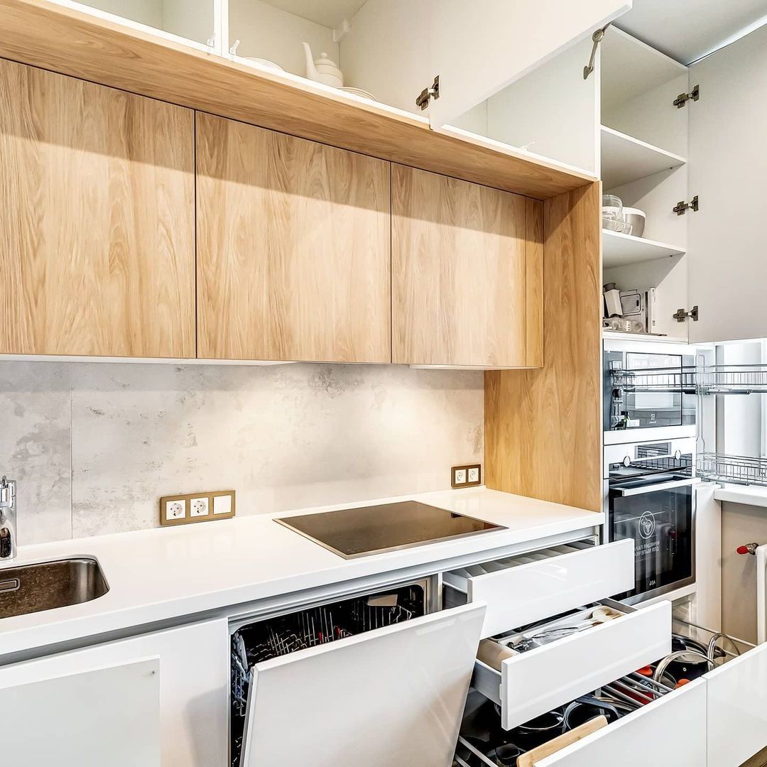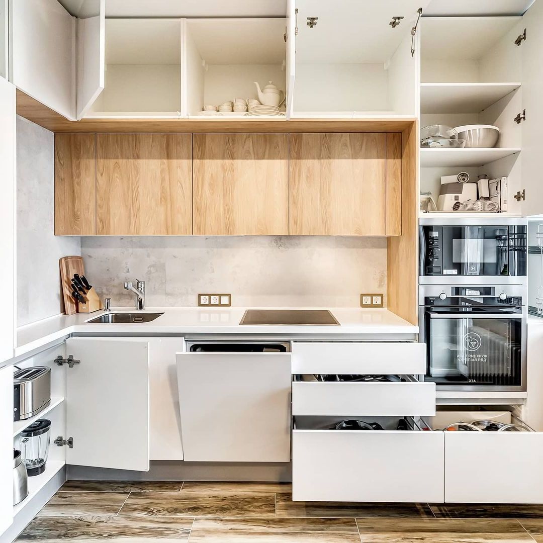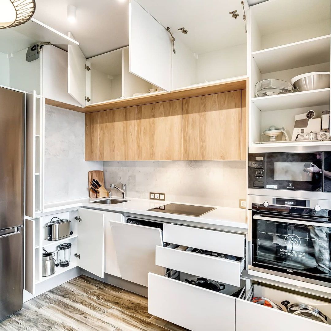 Если вы не хотите терять драгоценное пространство за стандартной фальш-панелью, поставьте карго — пользоваться кухней будет намного удобнее. Доставать масло или специи из такой корзины в разы удобнее, чем пытаться найти необходимое на полках узкого шкафчика. Выкатные ящики полного выдвижения - один из самых удобных и рациональных способов доступа, т.к. позволяет по максимум использовать пространство шкафчика, с простым доступом к любому предмету.
