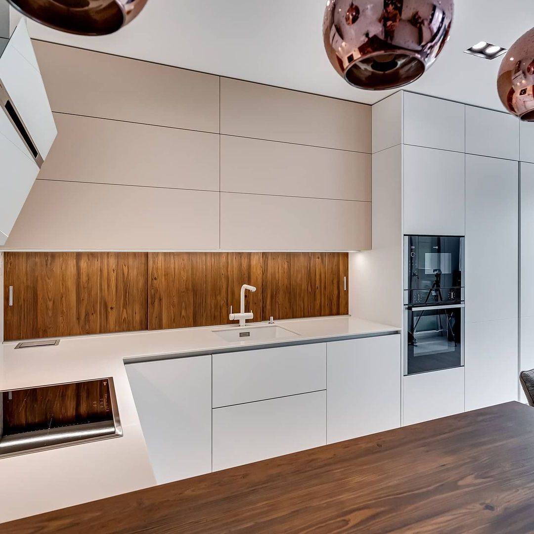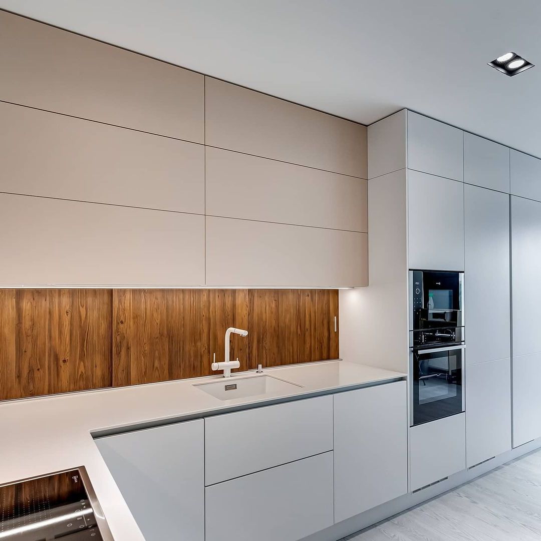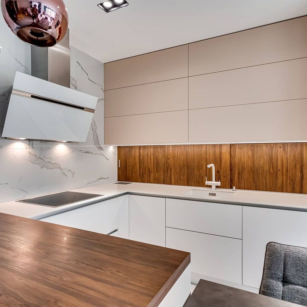 Скинали в цвет столешницы смотрится эстетично и гармонично не уступая по свойствам плитке.