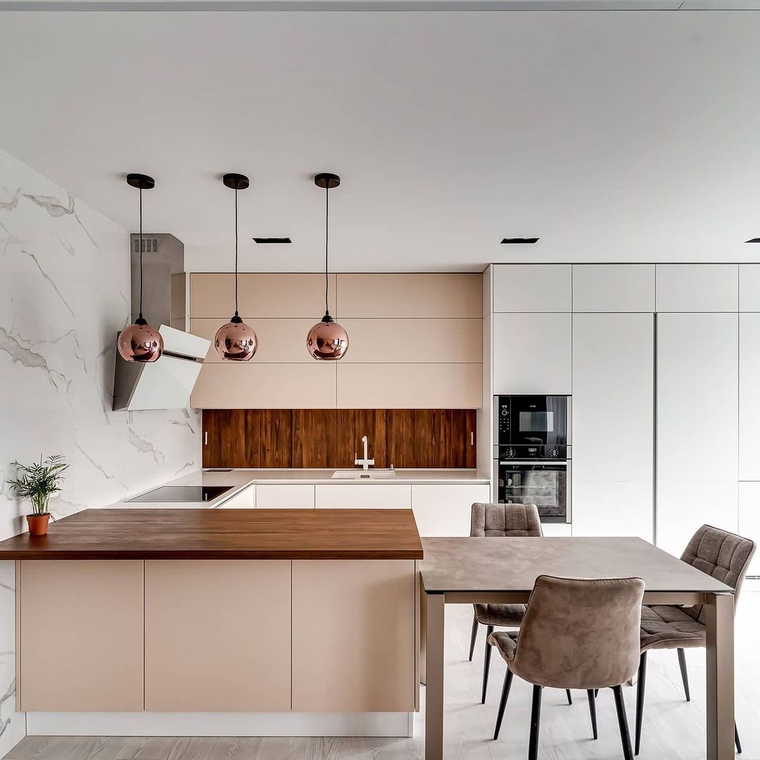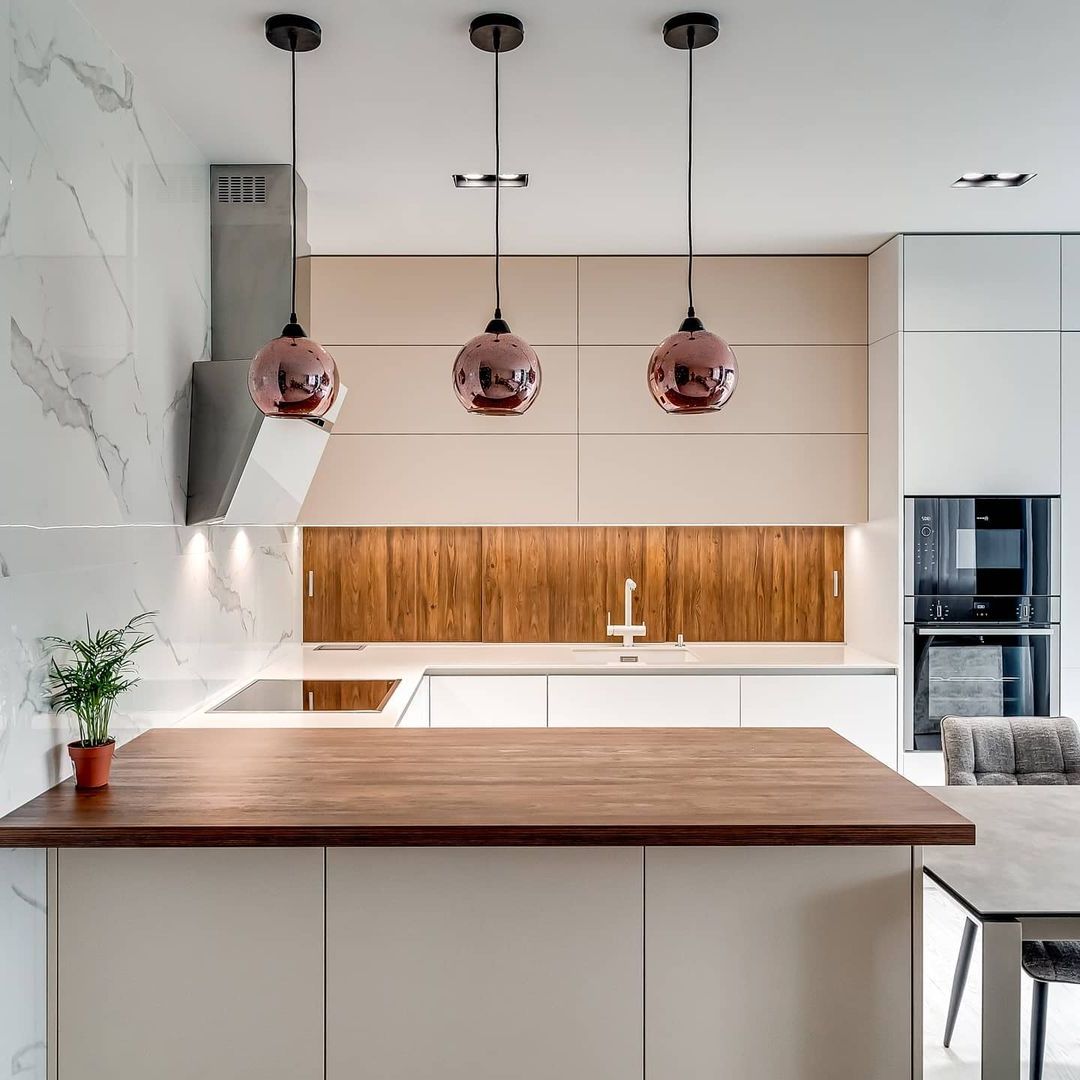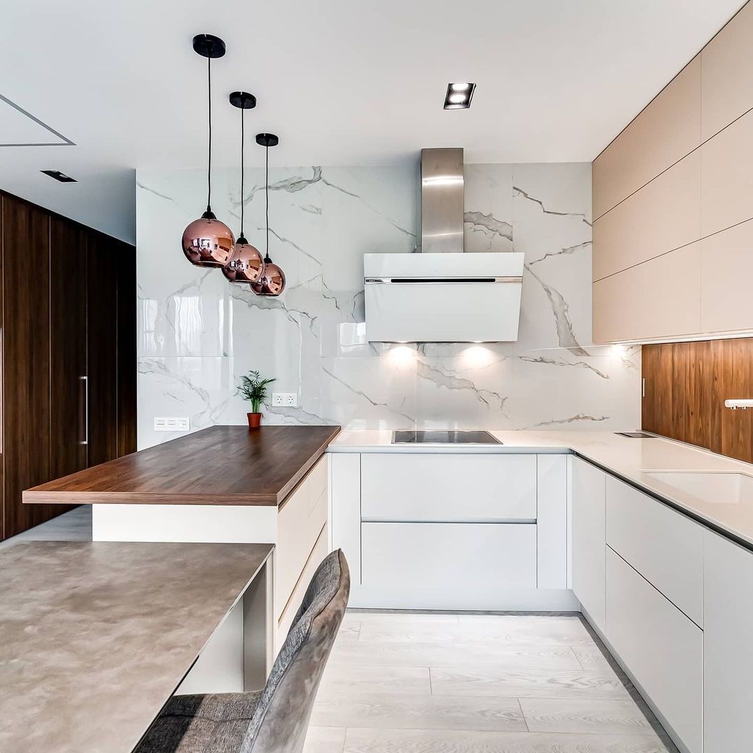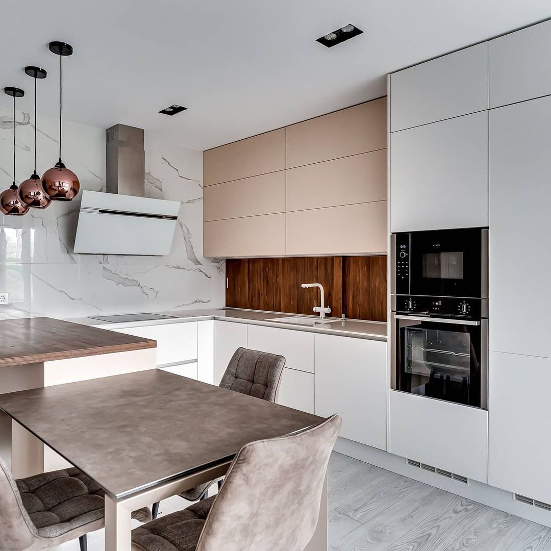 Скинали в цвет столешницы смотрится эстетично и гармонично не уступая по свойствам плитке.