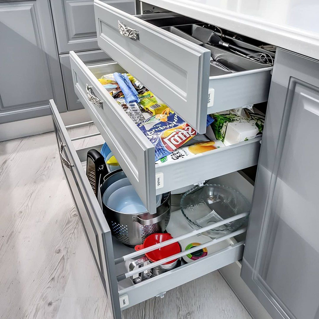Если вы не хотите терять драгоценное пространство за стандартной фальш-панелью, поставьте карго — пользоваться кухней будет намного удобнее. Доставать масло или специи из такой корзины в разы удобнее, чем пытаться найти необходимое на полках узкого шкафчика. Выкатные ящики полного выдвижения - один из самых удобных и рациональных способов доступа, т.к. позволяет по максимум использовать пространство шкафчика, с простым доступом к любому предмету.
