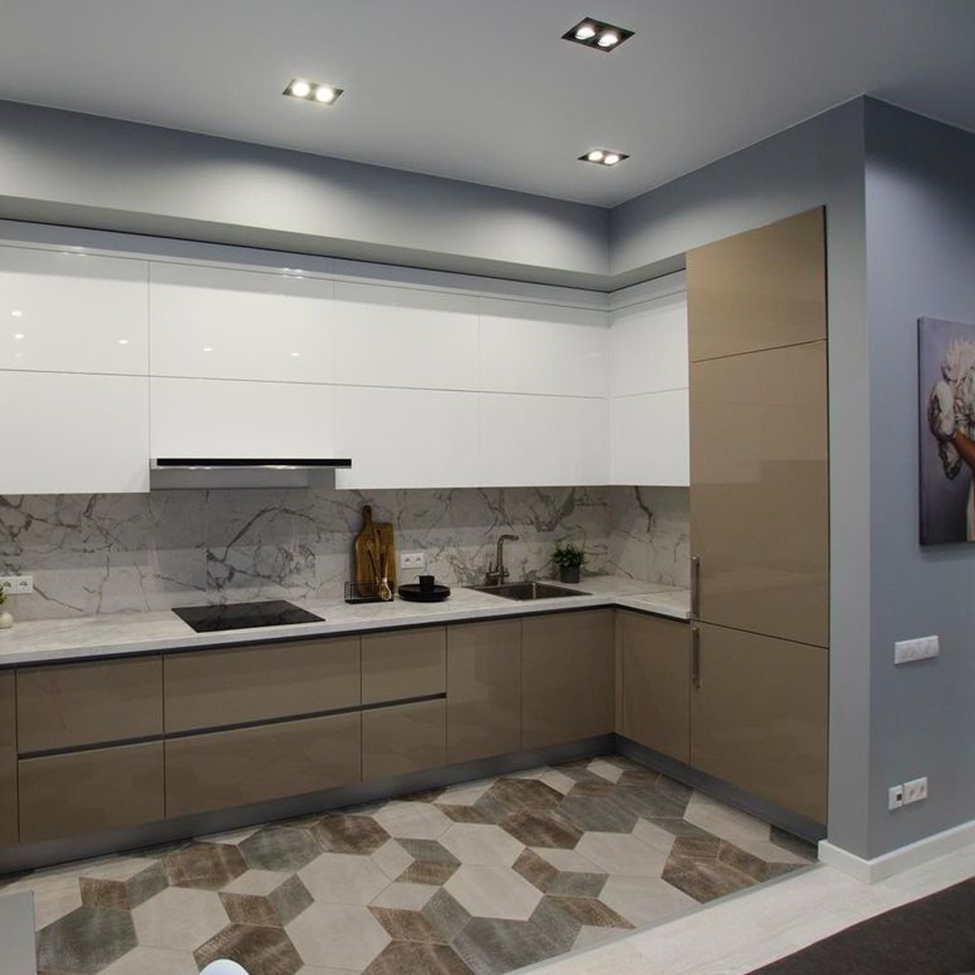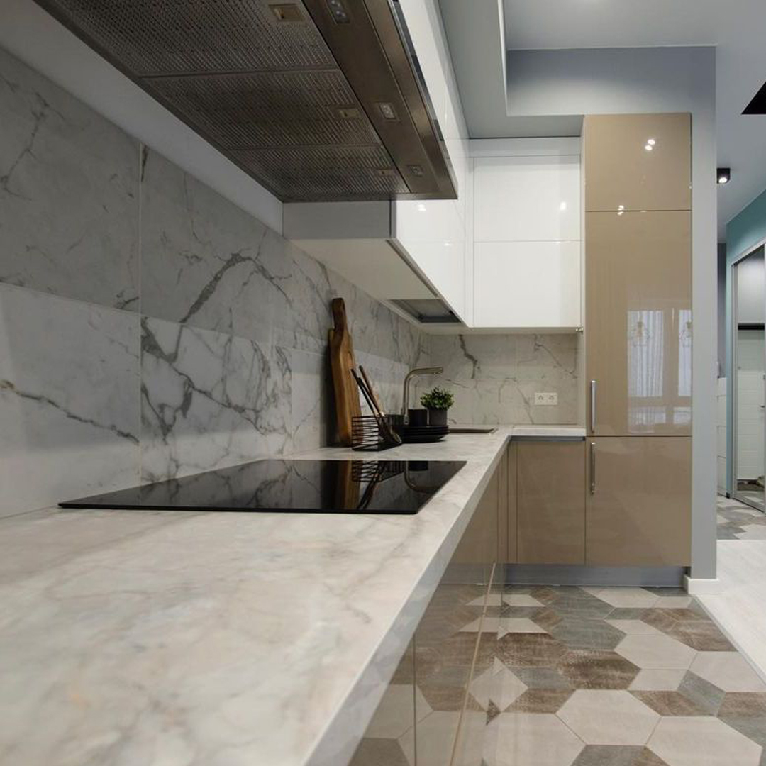 Скинали в цвет столешницы смотрится эстетично и гармонично не уступая по свойствам плитке.