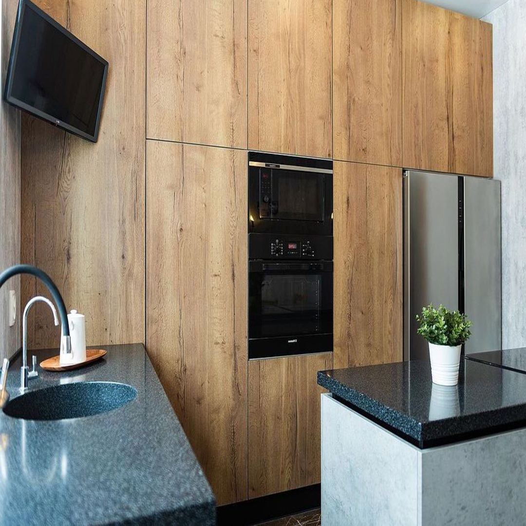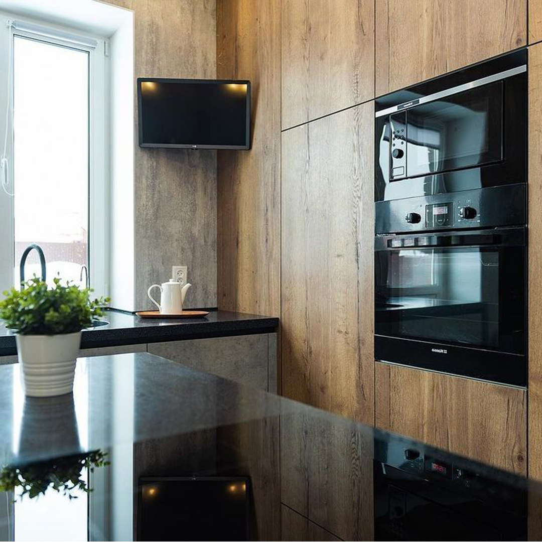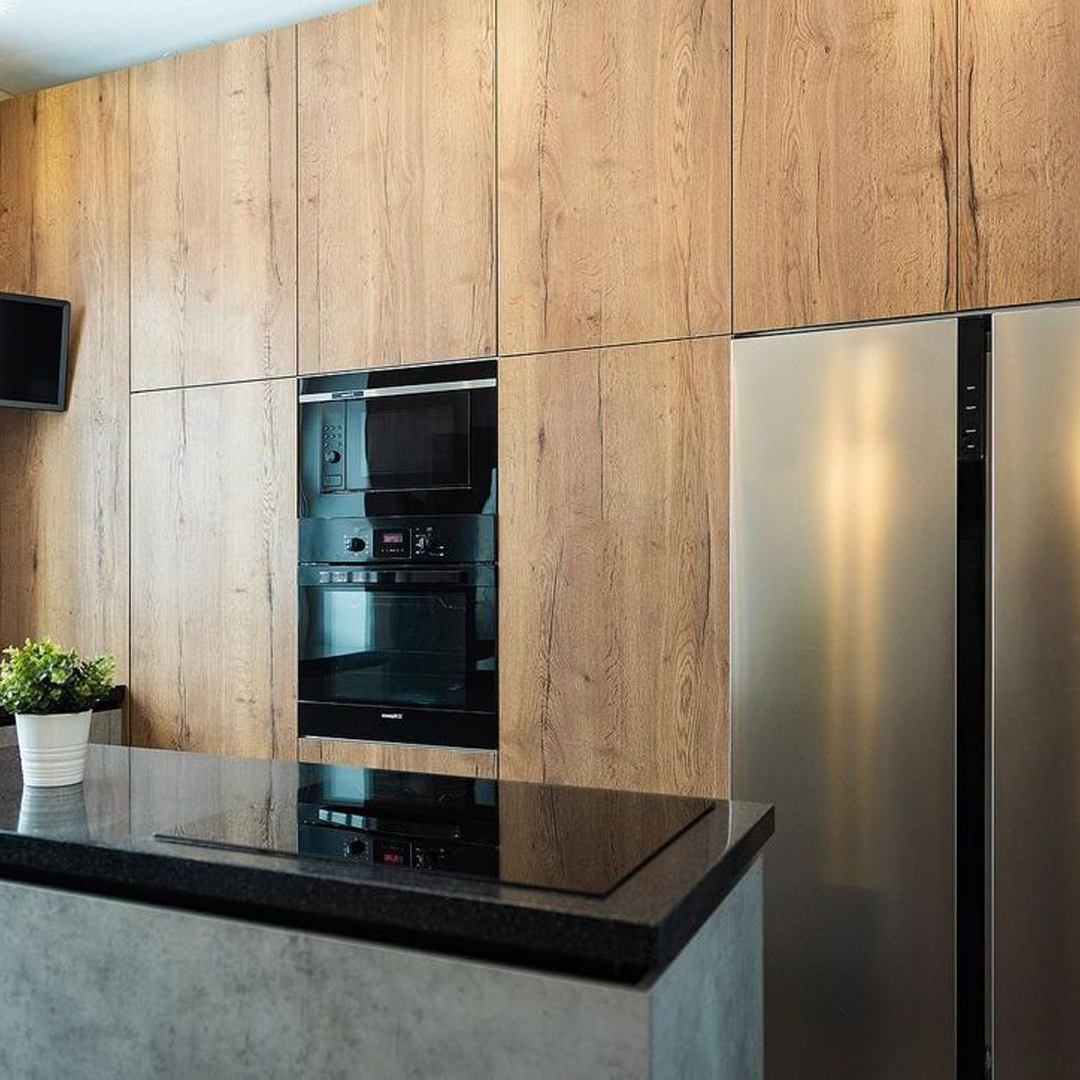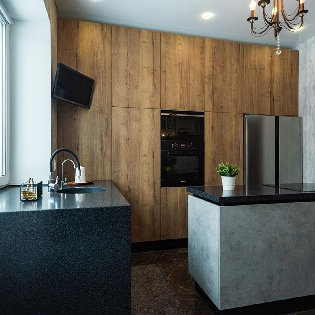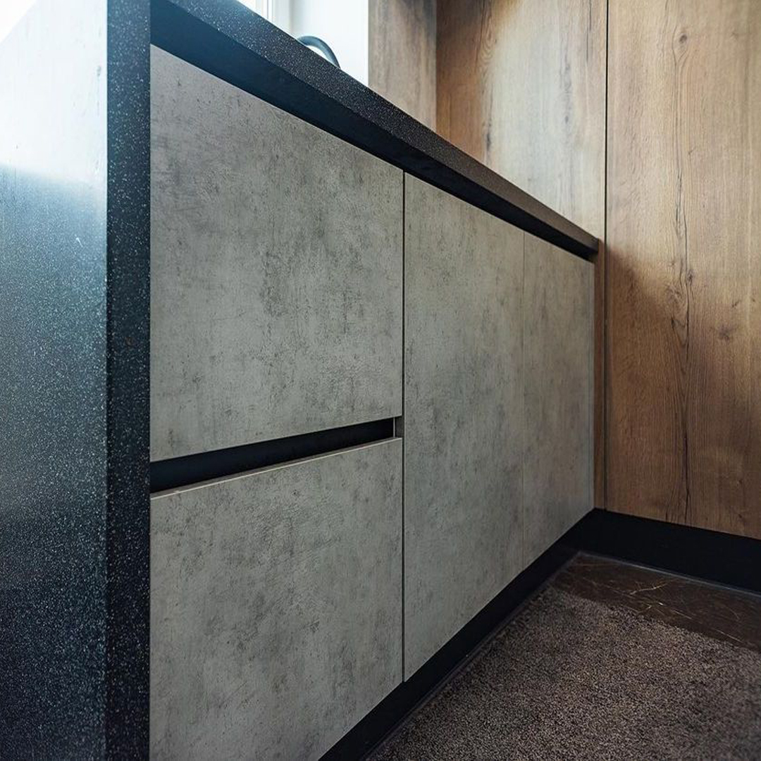 • Фасады — ламинированная плита (Egger, Австрия), декор бетон Чикаго, дуб Галифакс⠀