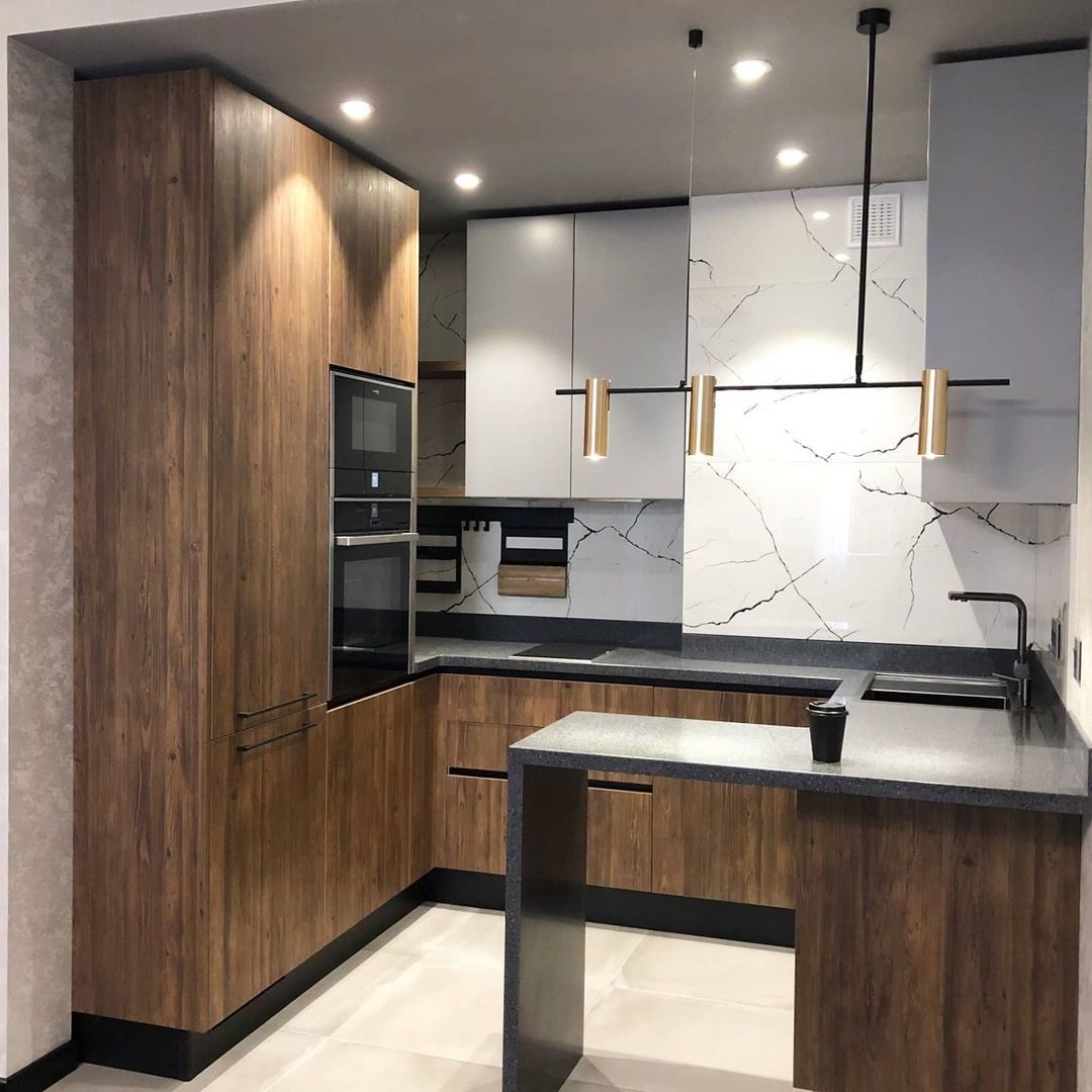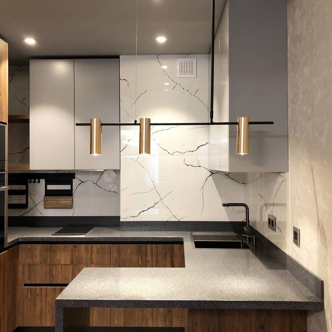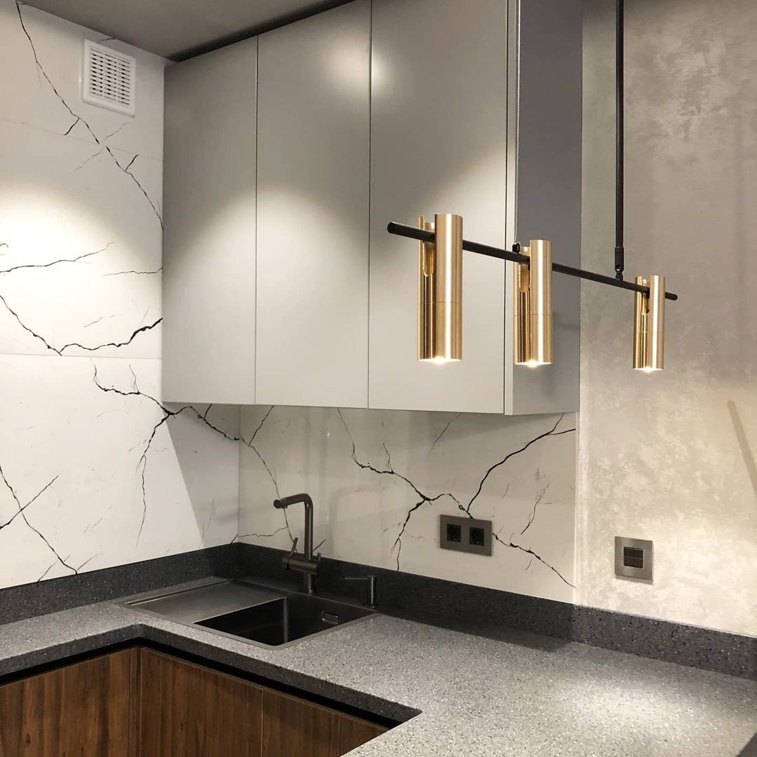 Скинали в цвет столешницы смотрится эстетично и гармонично не уступая по свойствам плитке.