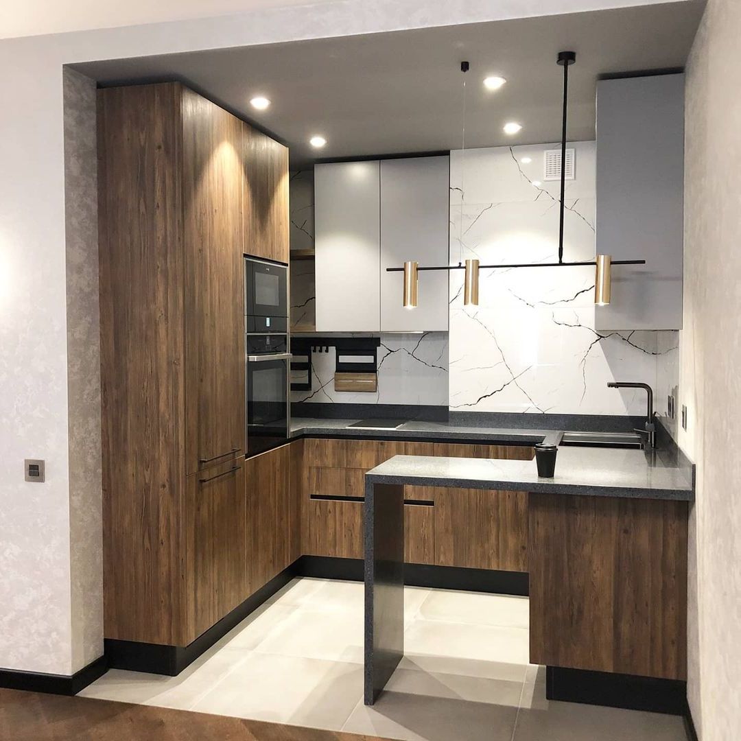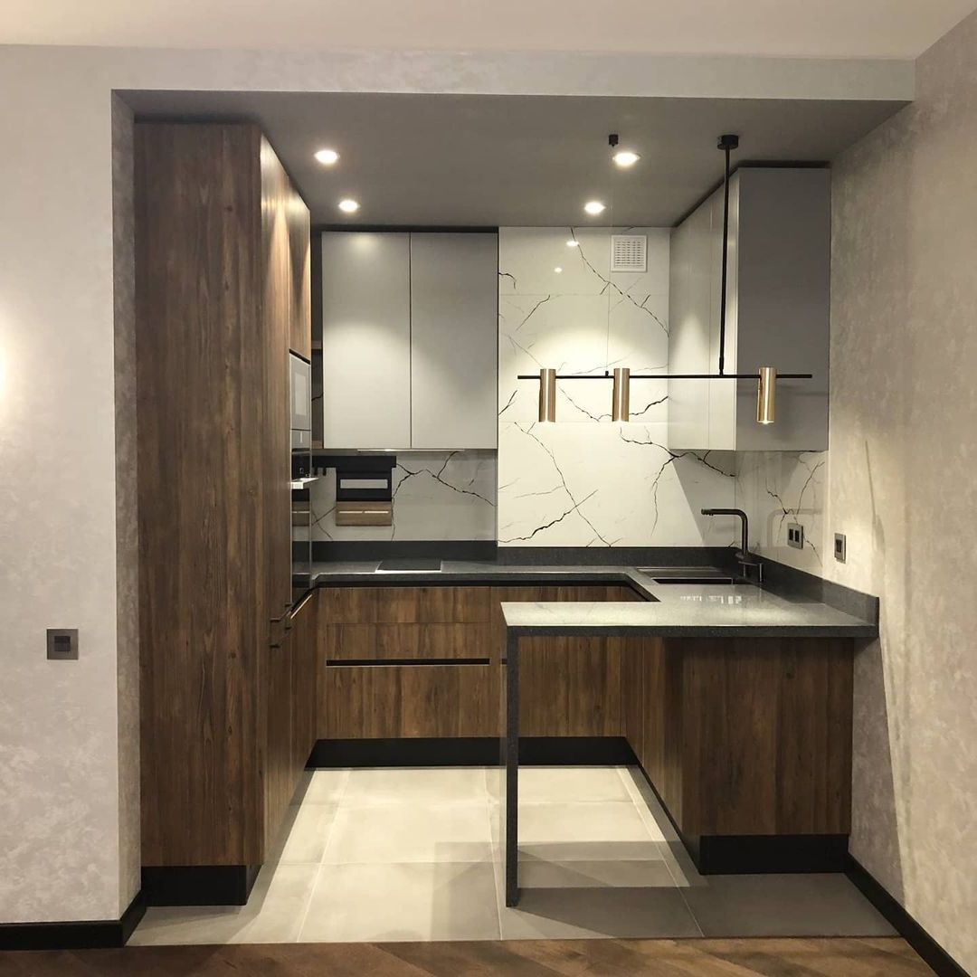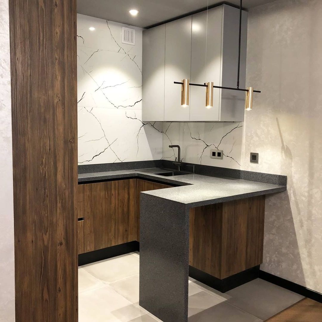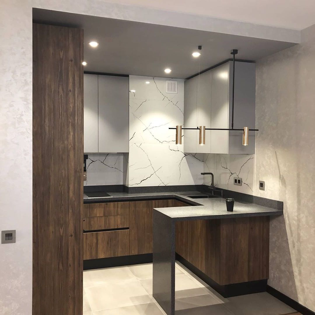 Скинали в цвет столешницы смотрится эстетично и гармонично не уступая по свойствам плитке.