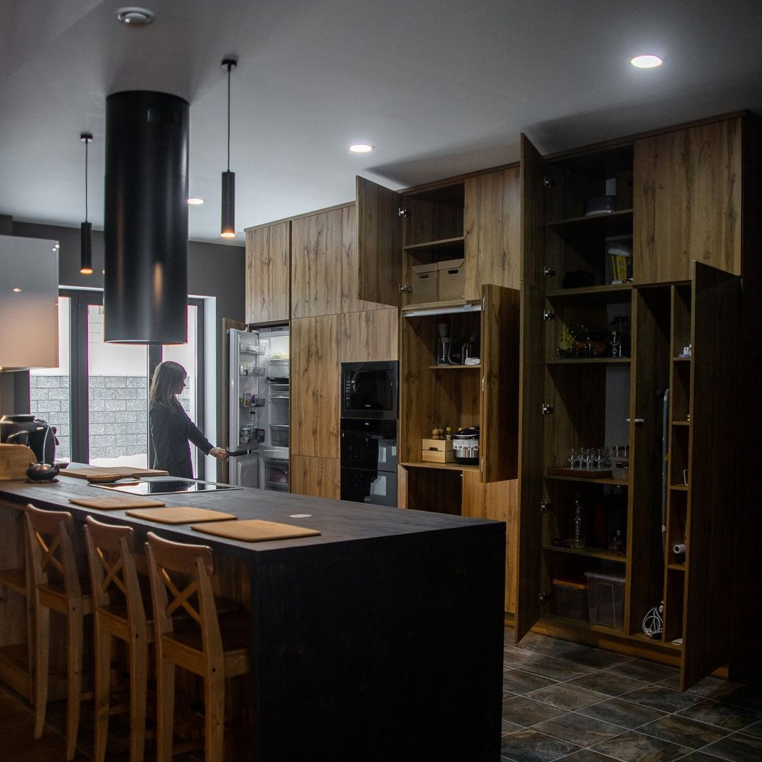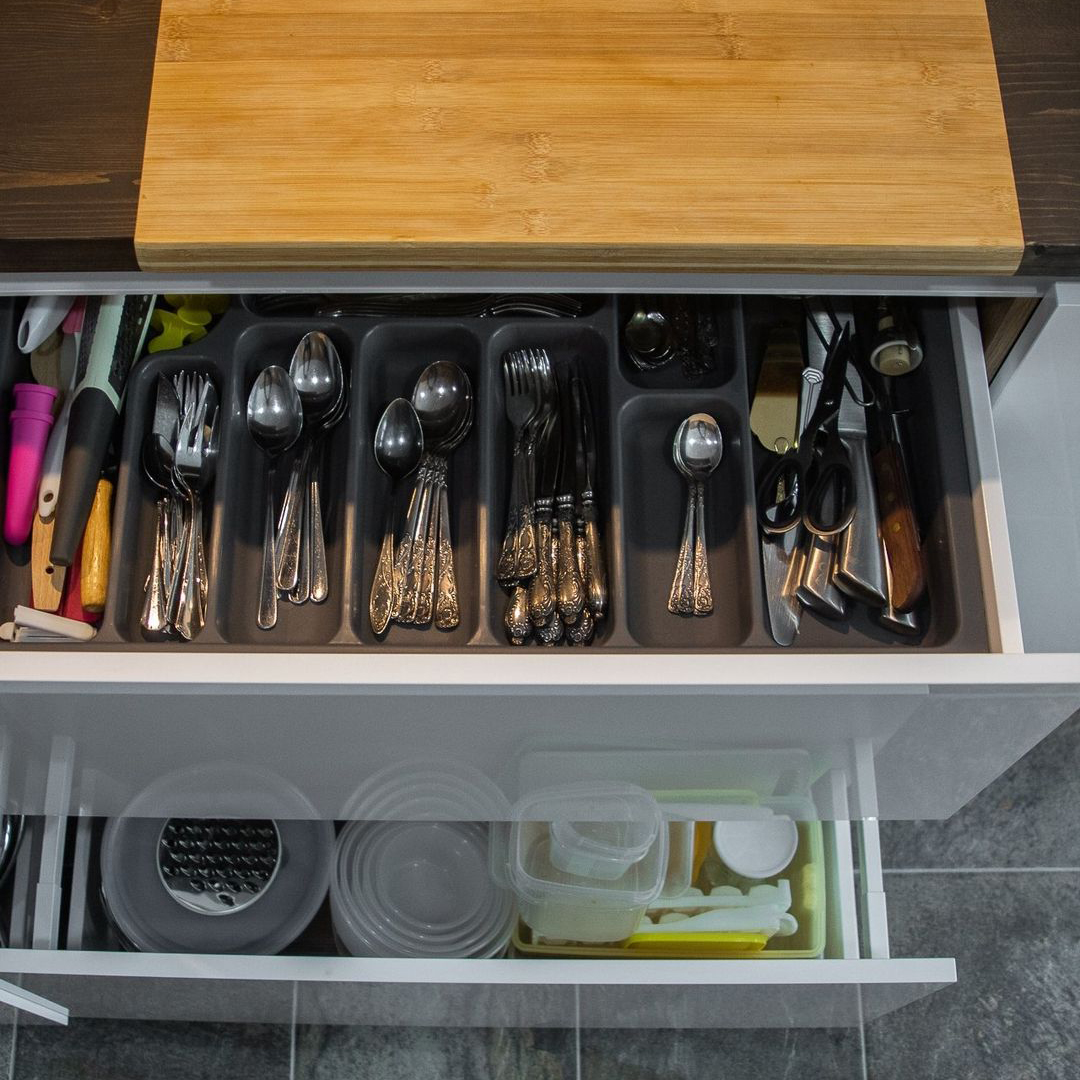 Если вы не хотите терять драгоценное пространство за стандартной фальш-панелью, поставьте карго — пользоваться кухней будет намного удобнее. Доставать масло или специи из такой корзины в разы удобнее, чем пытаться найти необходимое на полках узкого шкафчика. Выкатные ящики полного выдвижения - один из самых удобных и рациональных способов доступа, т.к. позволяет по максимум использовать пространство шкафчика, с простым доступом к любому предмету.